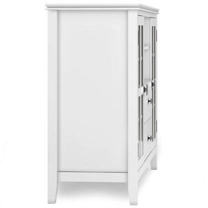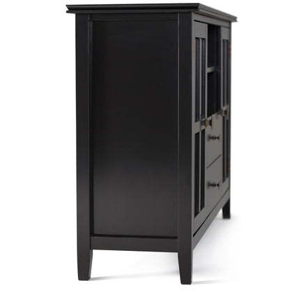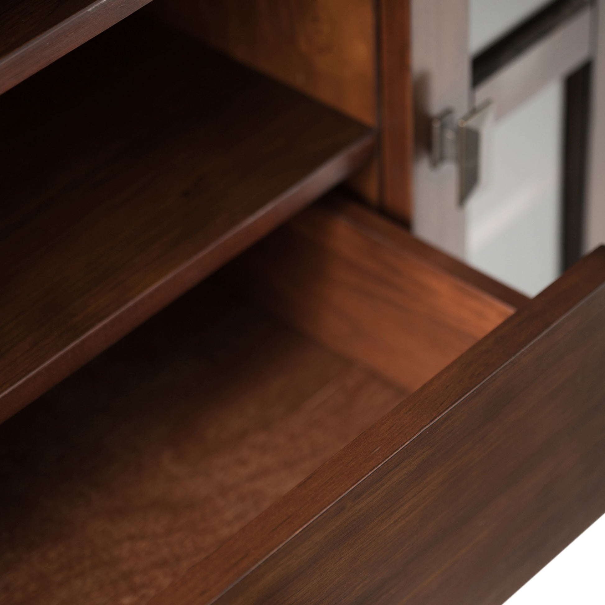 • Features two (2) central drawers with metal glides, open center area with adjustable shelf and two (2) side tempered glass framed doors that open to large storage spaces with two (2) shelves each