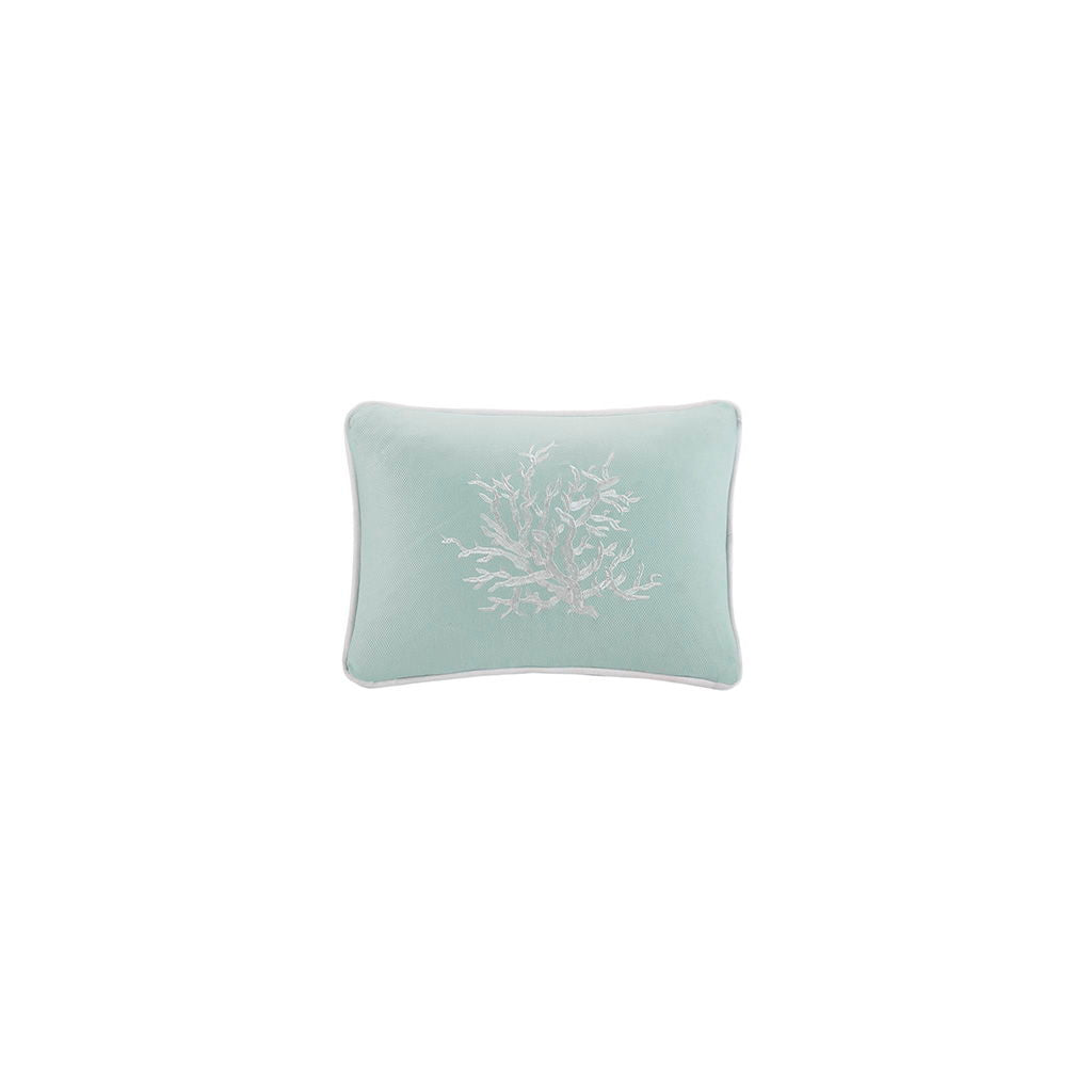 Bring a bit of sea side inspiration into your home with this beautiful bedding collection. The Harbor House Coastline collection features an intricate white coral motif embroidered on an aqua background finished with a pieced white border. Made of 100% cotton jacquard, this 12x16 inch oblong pillow is an accessory to the Coastline bedding collection and features a white embroidered coral on aqua background with white piping.