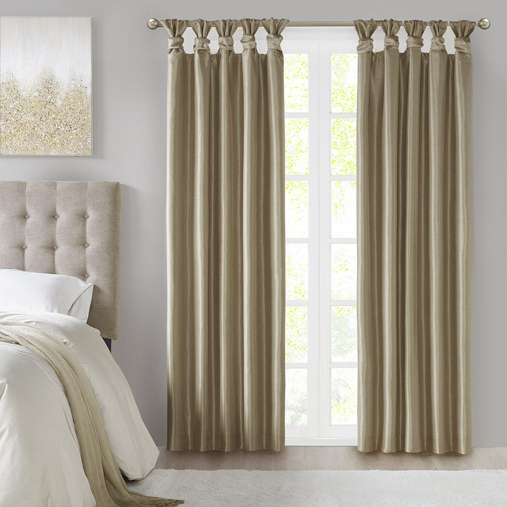 Energy efficiency meets a sophisticated style with the Madison Park Emilia Twist Tab Total Blackout Window Curtain. This window curtain panel showcases a DIY twist tab top finish that allows you to create an elegant display in your living room or bedroom space. The faux silk sheen base fabric features a 3 pass foamback liner on the reverse to block out all outside light, noise, and intrusion ensuring the highest level of privacy. Using thermal technology, the total blackout curtain helps provide maximum energy savings by keeping your room the perfect temperature through the seasons. While this window panel is also OEKO-TEX certified, meaning it does not contain any harmful substances or chemicals, this ensures quality comfort and wellness. This DIY twist tab total blackout window panel is perfect for use in bedrooms, media rooms, or any private space. As shown in the image, two curtain panels need to be purchased for each window; Fits up to a 2" diameter rod.