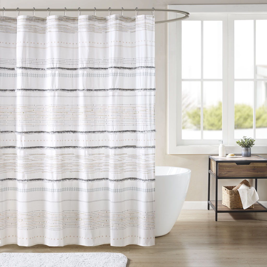 The INK+IVY Nea Cotton Printed Shower Curtain with Trims offers a stunning contemporary update to your bathroom. This 100% cotton shower curtain features tassels and a printed stripe pattern creating a chic boho look. Finished with 12 button holes at the top, this shower curtain is machine washable for easy care. Coordinating bedding set is available and sold separately.