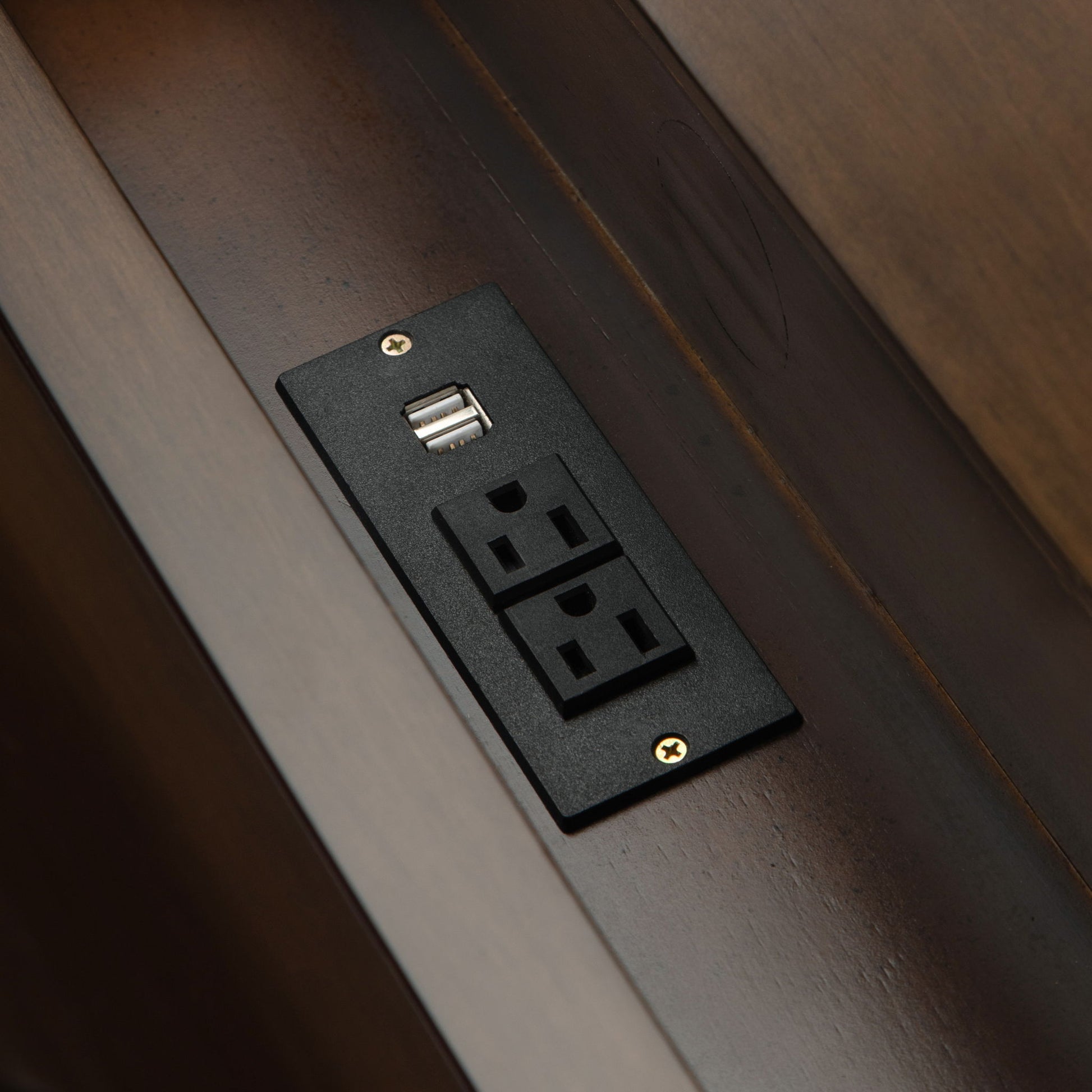 • Features three large drawers with metal glides, two lift top compartments with storage and cord management featuring 2 outlets with 2 USB ports
