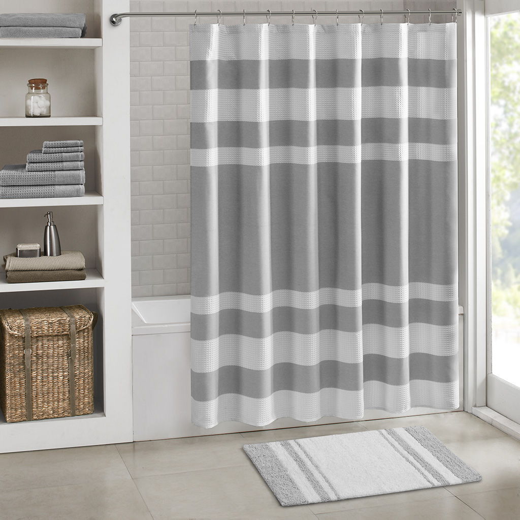 Update your bathroom with the Madison Park Spa Cotton Bath Rug. This 100% cotton, reversible rug has both cut and looped cotton on each side in contrast fashion colors to a white ground for a spa look within your home. The soft highly absorbent cotton on both sides will feel fluffy and absorbent on your feet! A rug pad is highly recommended for safety and to keep rug secured in place. Due to the looped cotton construction, some threads may come undone after wash/dry; simply cut and trim any loose threads by hand as needed. Machine washable for easy care; Complete the look with coordinating shower curtain, available and sold separately.