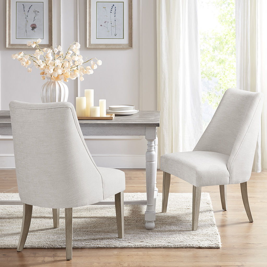 Enhance your dining space with the Martha Stewart Winfield Upholstered Dining Chair Set. Designed with a farmhouse-inspired look, these armless dining chairs feature tailored piping details and solid wood legs with a distressed finish for timeless appeal. The curved ergonomic back and plush padded seat ensure all-day comfort, while the soft yet durable chenille fabric adds a cozy touch. Built with a sturdy plywood frame, webbing support, and high-density foam, these chairs offer lasting durability. Easy to assemble and perfect for dining rooms, breakfast nooks, home offices, and more. Upgrade your space with this stylish and versatile seating set today!